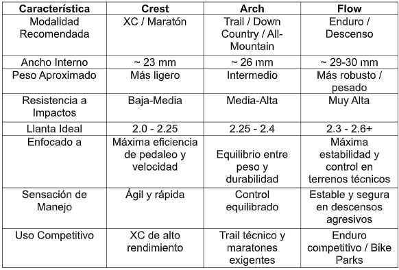 En sus líneas más recientes *MK4, las denominaciones **Crest, Arch y Flow* resumen lo que busca cada tipo de ciclista: una combinación equilibrada entre *anchura, resistencia, peso y uso ideal*.