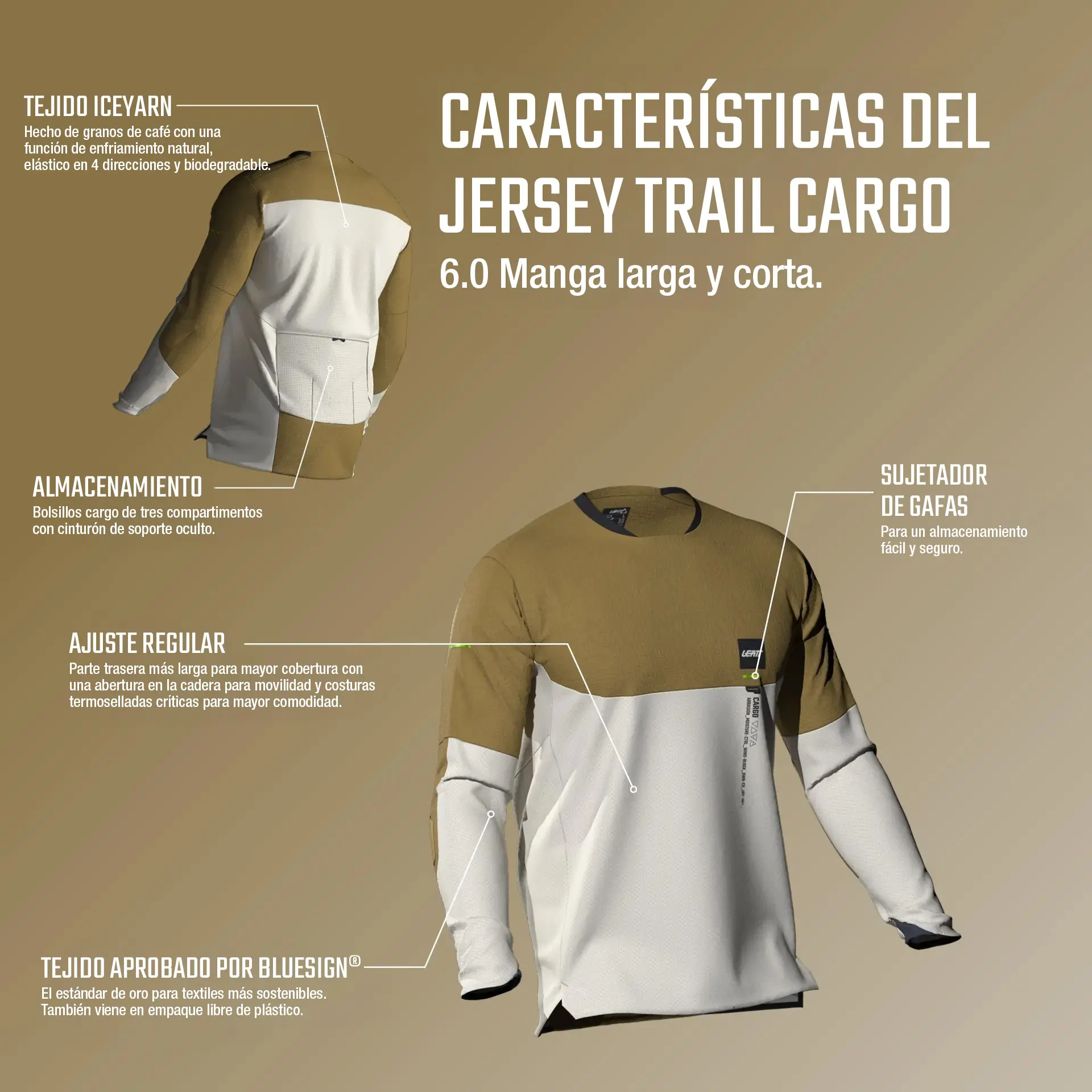 - Tejido: IceYarn (posos de café reciclados) con efecto refrescante, elasticidad en 4 direcciones y biodegradable